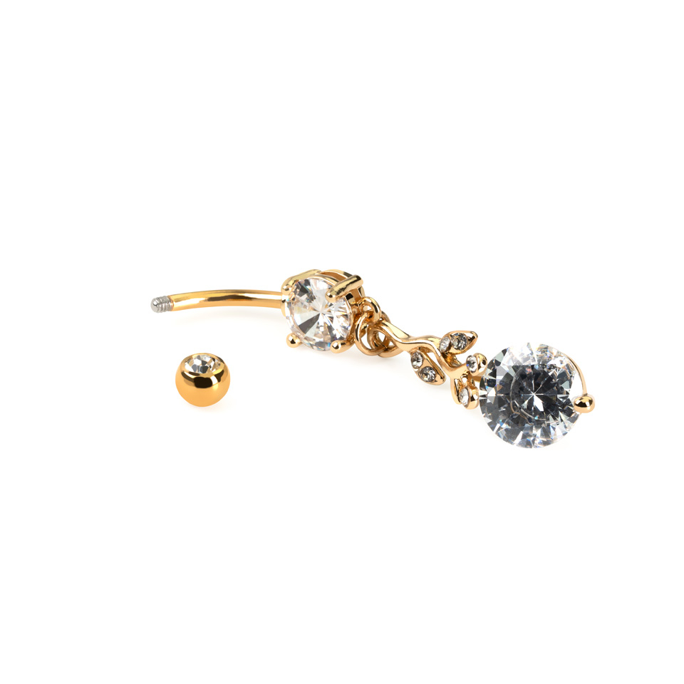 Juwelen met hanger voor de navel zijn vaak erg elegant. Dit sieraad is daar een goed voorbeeld van. Het is geïnspireerd in de natuur en heeft de vorm van een takje met bladeren, een ontwerp vol leven. Onderaan het staafje en de hanger is het juweeltje versierd met een grote zirkoniet. Beide steentje zitten met haakjes goed vast aan het sieraad zodat ze zeker niet loskomen.De piercing zelf is gemaakt van chirurgisch staal terwijl de hanger bestaat uit metaal. Het hele sieraad is gecoat om het zijn brilliante uitstraling te geven. Je kan kiezen tussen roodgoud, zilverkleurig of geelgoud - welke je ook kiest, de coatings zijn glanzend. Mocht dit je alvast ter hulp komen tijdens het kiezen, de gouden en roodgouden versie zijn gecoat met 14 karaats goud.