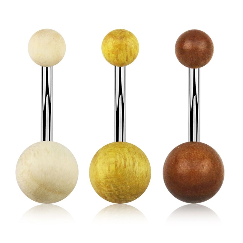 Je ziet zelden sieraden gemaakt van hout. Wanneer je ze ziet, is het vaak alleen voor gebruik in het oor. Dit sieraad is echter niet 100% van hout, omdat het staafje van chirurgisch staal is. Maar het staafje is verborgen in de navel, dus je ziet alleen de ballen. Hier kun je kiezen uit drie verschillende houtsoorten, waarbij de kleur het enige verschil is (naast de naam van de boom). De boomsoorten zijn krokodilbomen, de lichtste daarvan, saba (roodachtig bruin) en jackfruit (geel). Alle modellen hebben gemeen dat er aan de bovenkant een bal zit van 5 mm en aan de onderkant zit een bal van 8 mm. Beide ballen kunnen worden losgeschroefd.