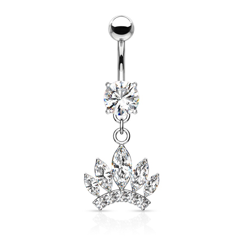 Word een prinses voor een dag, of zelfs langer met de hulp van deze mooie navelpiercing met een kroontje van steentjes als hanger. Deze ultra vrouwelijke prinsessenkroon bestaat bijna uitsluitend uit stenen. Voor de puntjes zijn ovalen steentjes gebruikt, die net als bij een echte kroon verschillende lengtes hebben. De basis van de kroon bestaat uit kleine ronde stenen die alles perfect afmaken.