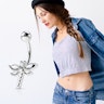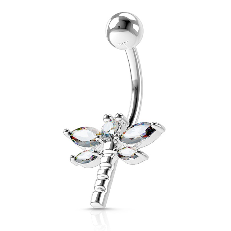 Deze prachtige navelpiercing heeft een libelle i.p.v. een sluitbal, die met vijf kleine, transparante steentjes versierd is.Dit sieraad heeft natuurlijk de normale standaardmaat en bestaat uit het veilige chirurgische staal dat geen nikkel bevat.