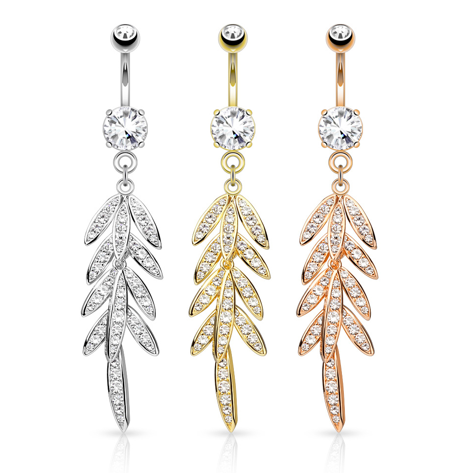 Mooi en elegant voor je navel, met op de hanger een lange rij van kleine blaadjes die vrij kan bewegen door het kleine ringetje waarmee het verbonden is aan het staafje. Alle blaadjes zijn prachtig versierd met kleine, transparante steentjes. In totaal zitten er 50 fonkelende steentjes op dit sieraad en al deze steentjes zorgen voor het prachtige lichtspel dat ontstaat als het licht op het juweel valt.