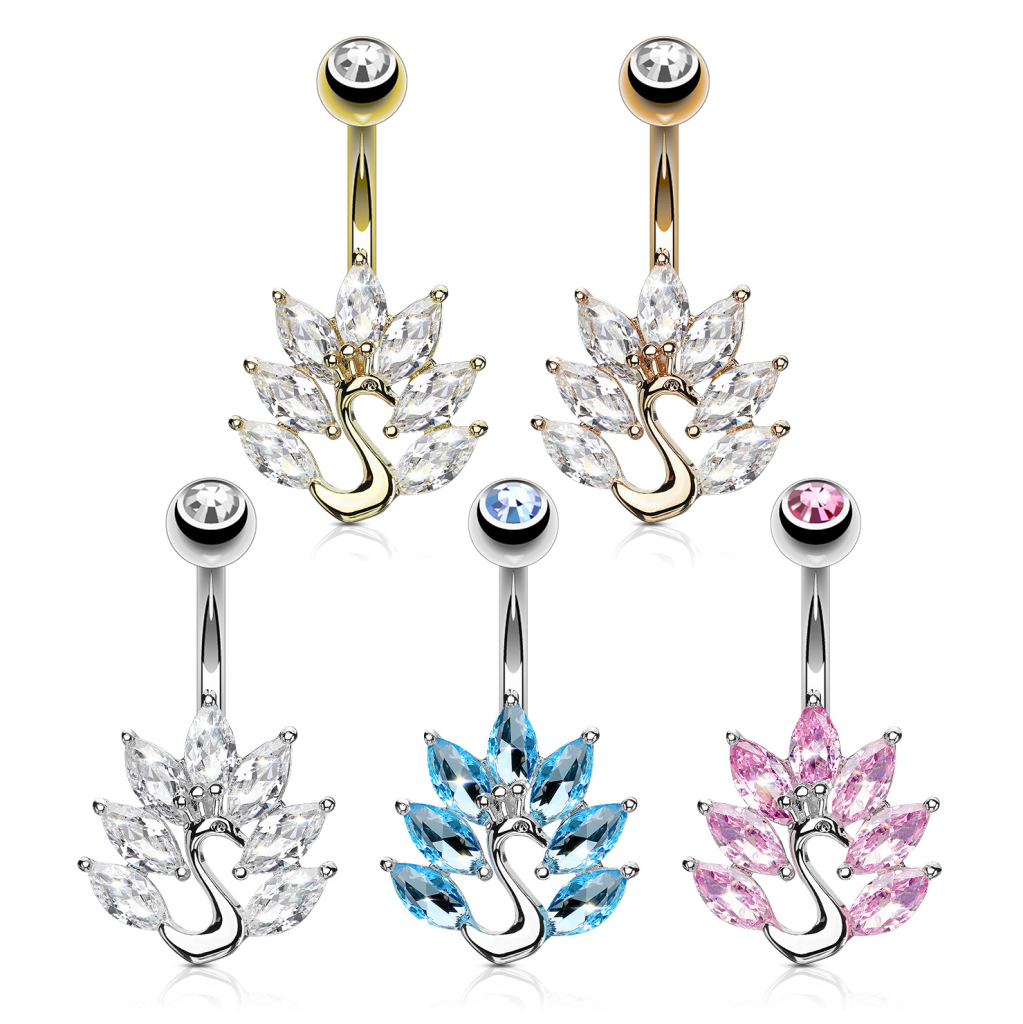 De navelpiercing die je op de afbeelding hierboven ziet, stelt een pauw voor. De pauw heeft met zijn marquise-geslepen steentjes zijn staartveren helemaal uitgeslagen, wat onderdeel is van seksuele selectie, waarbij de mannetjes elkaar intimideren. Normaal gesproken hebben ze tussen de 100 en 150 staartveren - hier zie je er slechts zeven, gemaakt van steentjes.