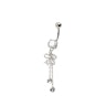 Deze navelpiercing is een iets langere. Het meet iets minder dan 6 cm. De lengte van de staaf is 10 mm van de totale lengte. De rest bestaat uit bling en decoratie in de vorm van stenen, kettingen en een boog. De lus bestaat uit messing en twee druppelvormige stenen, die net onder de steen onderaan de staaf zitten. Onder de lus zitten twee kettingen, waar aan elke ketting een duidelijke steen zit. De ene ketting is langer dan de andere.