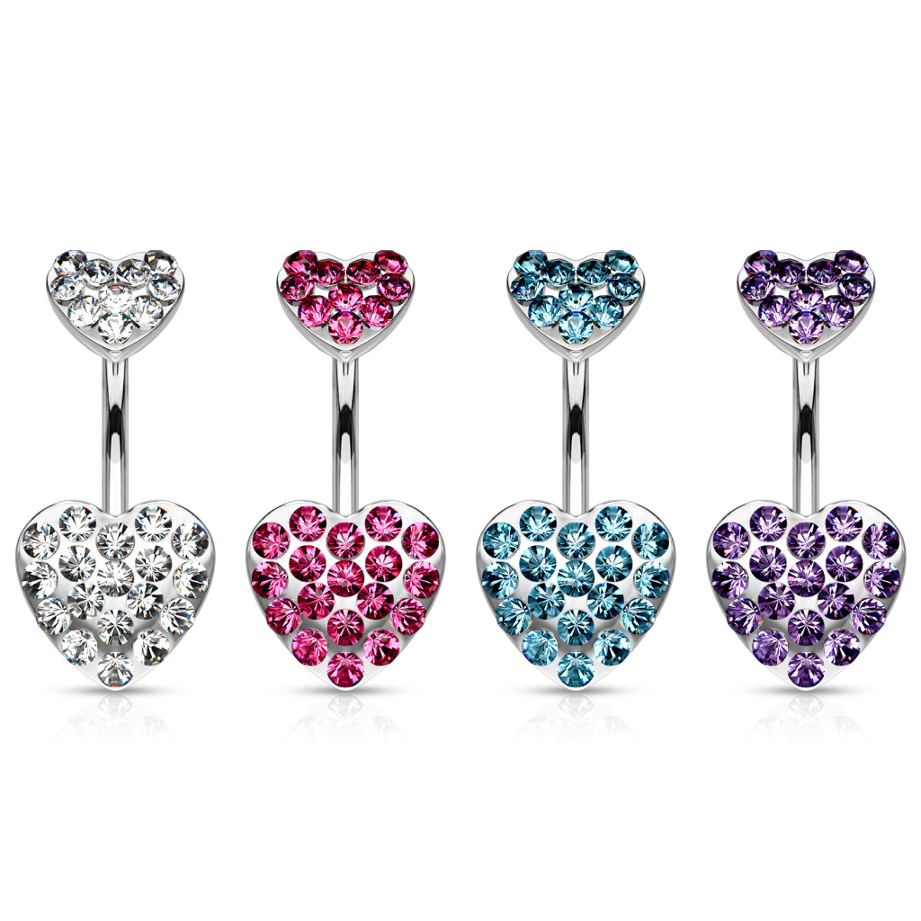 Het sieraad is gemaakt van chirurgisch staal en heeft een 10 mm lange staaf. Maar in plaats van een doorsnee top- en onderballetje, is er bij dit sieraad gekozen voor twee mooie hartjes met steentjes. Dat is ook vrijwel het enige dat te zien is als je het sieraad draagt. De vele kleine steentjes zijn allemaal facet geslepen, en deze reflecteren het licht dat vanuit alle hoeken komt dan ook prachtig. Dit zorgt ervoor dat het sieraad prachtig fonkelt in je navel. Je kunt kiezen tussen vijf frisse kleuren voor je hartjes, die allemaal even mooi zijn. Alleen jij hoeft slechts nog te kiezen welke het meeste in de smaak valt.