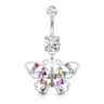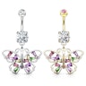 Op de afbeelding zie je wat je je moet voorstellen als een vlinder je navel doorboort. De vlinder heeft op zijn vleugels veel kleine steentjes in verschillende kleuren. De stenen hebben verschillende vormen en bieden een leuk spel met de rest van het sieraad. De vlinder is gemaakt van messing dat vervolgens is bedekt met of bladgoud, of rhodium, om dezelfde kleur te krijgen als de rest van het sieraad. Je kunt kiezen tussen de twee kleuren, waarbij ook de steen in de bovenste bal zal verschillen, afhankelijk van welk materiaalkleur je kiest. Zoals je op de afbeelding kunt zien, krijg je een roze steen in de bovenste bal als je de vergulde versie kiest en een heldere steen als je de zilverkleurige variant kiest. Verder blijft het sieraad gelijk.