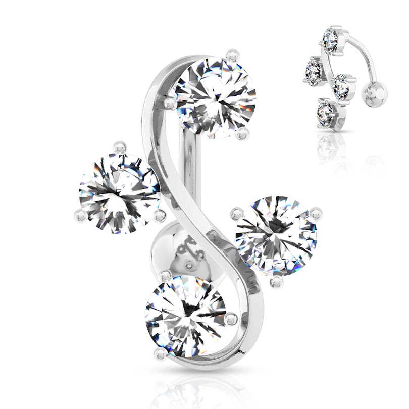 Een schattige en ondeugende navelpiercing met vier ronde stenen, die iets verzet zijn om een grote ''S'' te vormen. Door de grote afstanden tussen de steentjes, ziet deze navelpiercing er bijzonder mooi uit, aangezien er een beetje huid zichtbaar is. Dit sieraad bestaat uit het meest gebruikte materiaal, namelijk chirurgisch staal en geeft dan ook geen nikkel vrij.