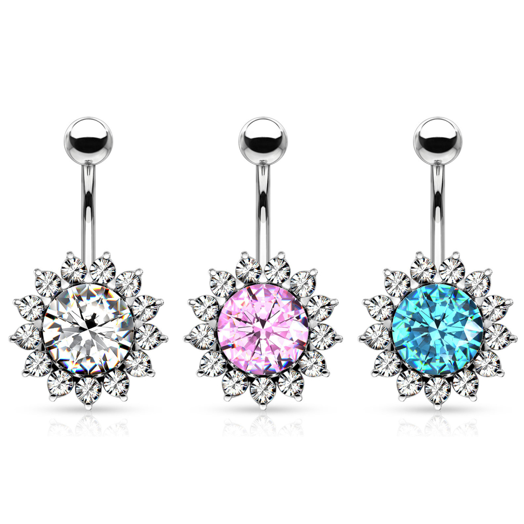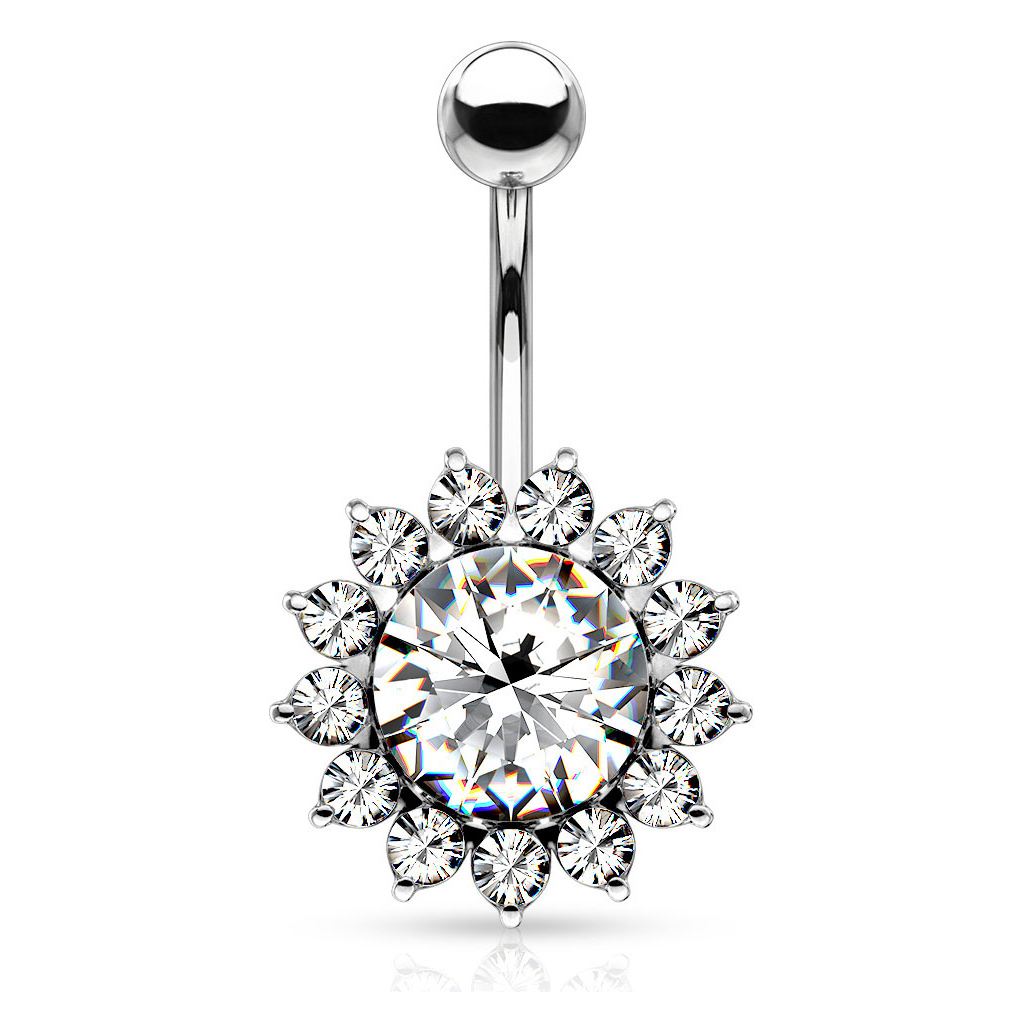 Deze navelpiercing heeft een prachtige, grote steen in het midden die het licht ongelooflijk goed opvangt en reflecteert. Rond de grote steen zijn veel kleine steentjes ingezet die samen een bladachtig ontwerp voorstellen.