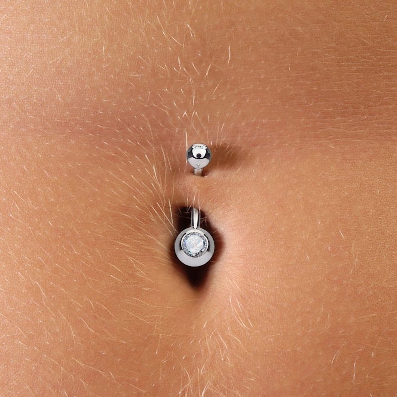 Het sieraad is als een bescheiden standaardsieraad gevormd, met een gebogen staaf en twee sluitballetjes. De beide balletjes zijn tevens ook nog met een hele mooie steen versierd, wat het totale plaatje van deze navelpiercing nog eleganter maakt.