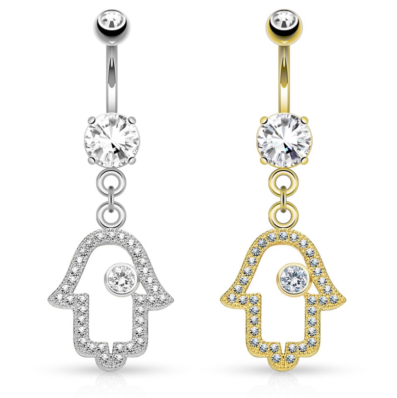 Naam: Navelpiercing van 14 karaats goud met hamsahand met steentjes
