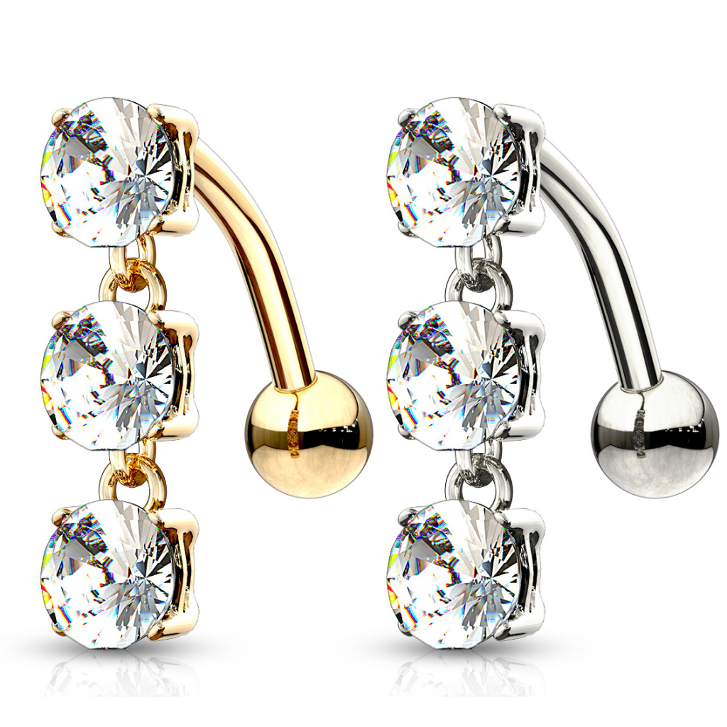 Naam: Navelpiercing van 14 karaats goud met omgekeerde hanger en drie steentjes