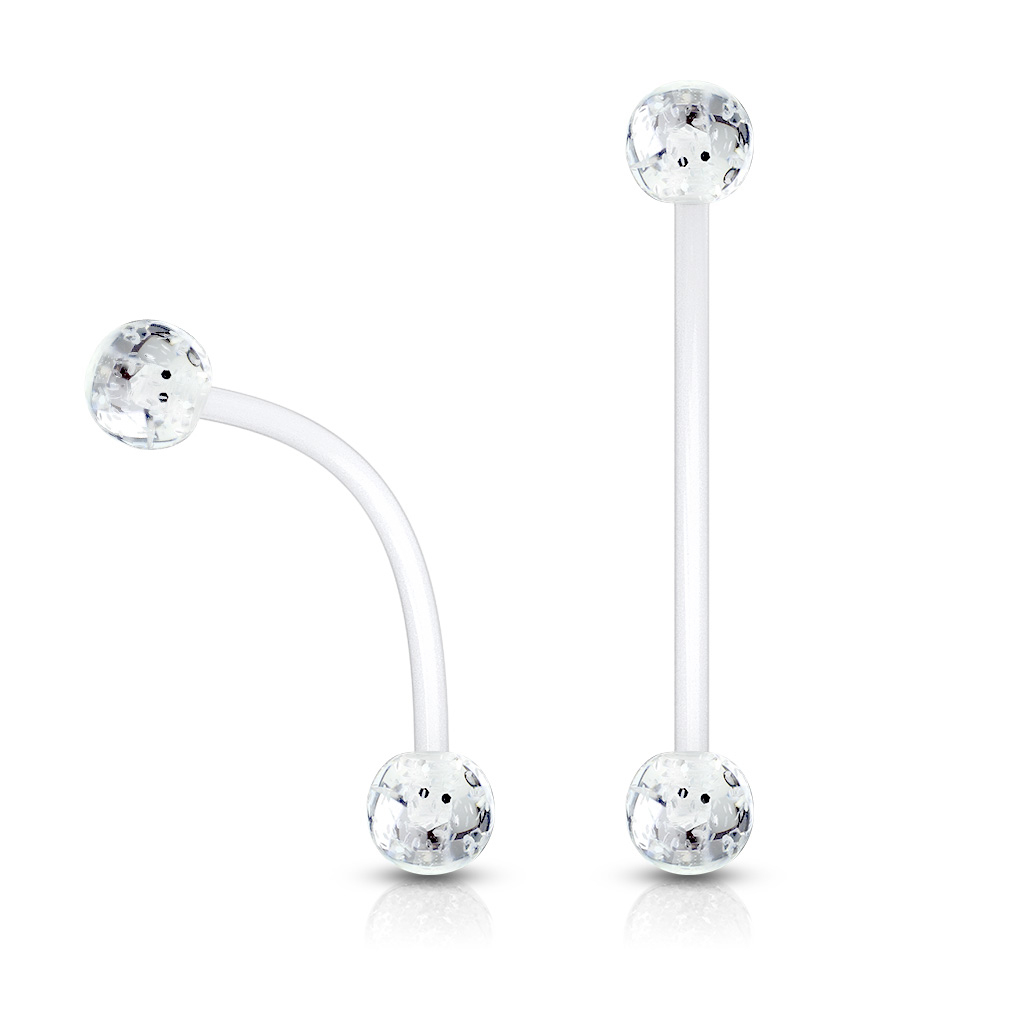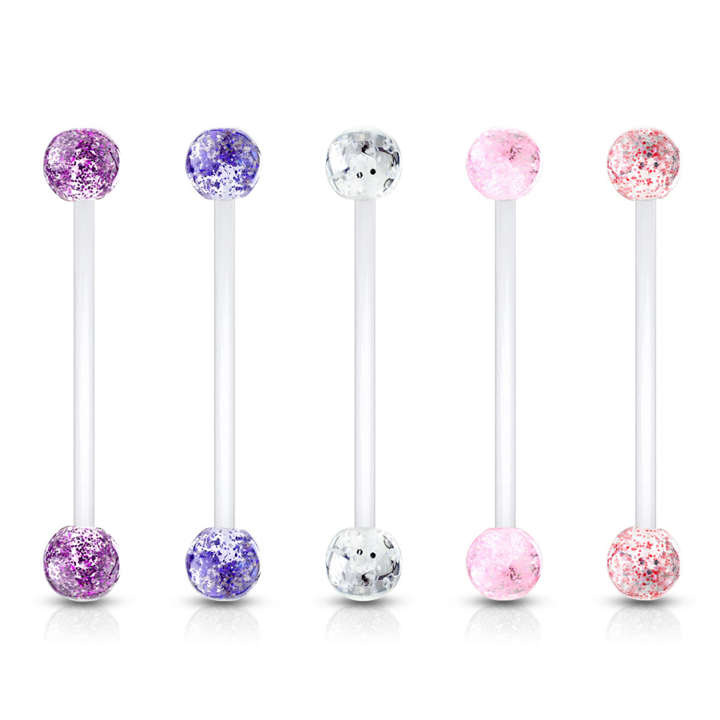 De balletjes aan elk uiteinde van het staafje bestaan uit acryl. Ze zijn versierd met een prachtig glitterpatroon en meten 6 mm. Bestel de piercing met balletjes in de door jou gewenste kleur, met bijvoorbeeld roze of blauwe glitterballetjes.