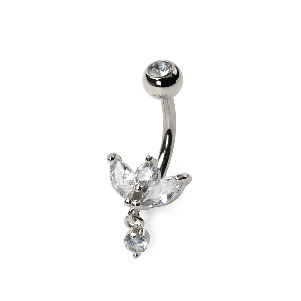 Klaar om te shinen met deze oogverblindende navelring van chirurgisch staal? Dit sieraad draagt een prachtig trio van markies-geslepen zirkonia steentjes, waaraan een subtiel steentje bungelt. De navelring is gemaakt van chirurgisch staal, wat bijdraagt aan de duurzaamheid en het comfort. Het staafje is 10 mm lang en heeft een draaddikte van 1.6 mm. Je kan kiezen tussen goud, zilver en rosé goud met transparante steentjes. Omarm glamour en projecteer zelfvertrouwen!