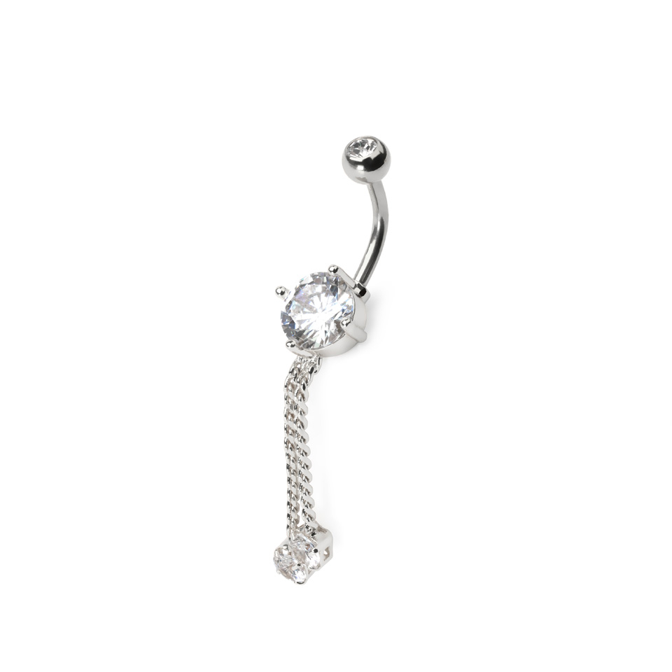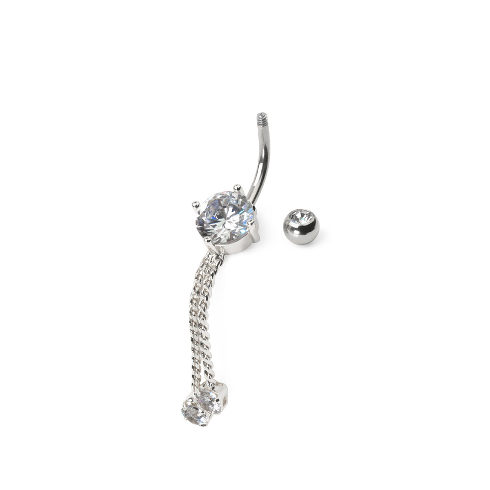 Deze mooie navelring is echt een statement piece. De kettinkjes zijn is afgewerkt met kleine steentjes en bungelen aan een grote transparante steen. Talk about elegantie en beweging! Dit unieke sieraad is gemaakt van chirurgisch staal, wat zorgt voor duurzaamheid en comfort. Het staafje is 10 mm lang en heeft een draaddikte van 1.6 mm. De kettinkjes vallen 28 mm vanaf de centrale steen. Je kan kiezen tussen een gouden, zilveren of rosƩ gouden finish met transparante steentjes. Deze navelring is zeer geschikt om extra glans aan je look toe te voegen.