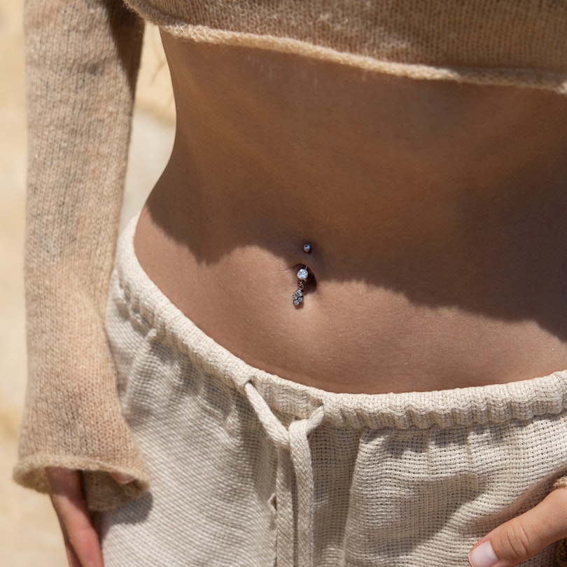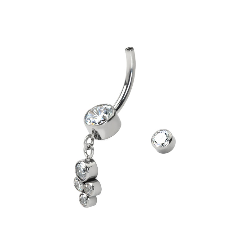 Dit navelstaafje rockt een cluster van vier steentjes die aan de grote glinsterende steen bungelen. Het prachtige sieraad is gemaakt van titanium, perfect dus voor nieuwe piercings gezien de hypoallergene kwaliteiten.