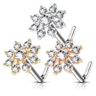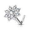 Het staafje van de piercing is gemaakt van chirurgisch staal dat gebogen werd in een hoek van 90 graden, wat betekent dat het sieraad perfect in je neus op zijn plek zal blijven zitten en dus gegarandeerd niet uit je neus zal vallen elke keer dat je je hoofd beweegt. Het uiteinde van de piercing, de ster die je op de foto ziet, is gemaakt van messing en werd gecoat om verschillende kleuren te verkrijgen. De goudkleurige versies werden bedekt met 14 karaats geel goud of 14 karaats roodgoud. Het zilverkleurige model werd gecoat met rhodium. De ster op de punt van het sieraad is ingelegd met glanzende steentjes die elk via een "armpje" vastzitten aan het centrum dat versierd is met een iets groter steentjes.
