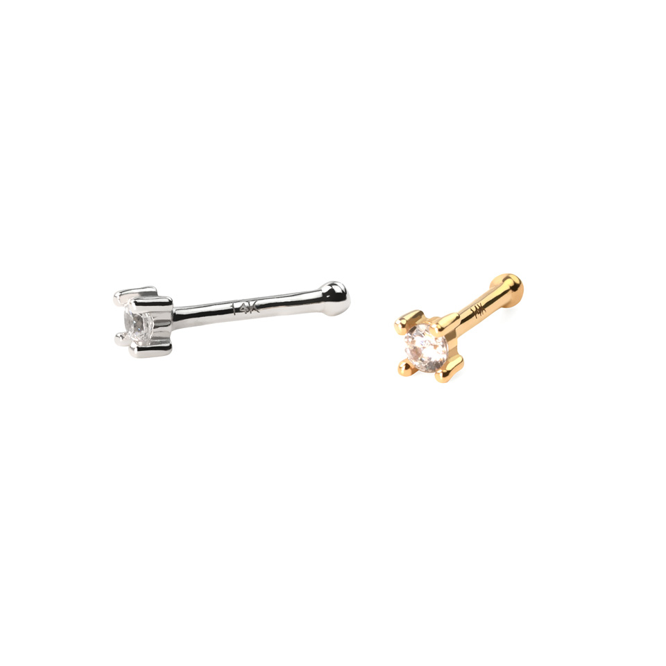 Eenvoudige sieraden zijn vaak de mooiste - vooral als het een sieraad is van 14 karaats goud. Het juweel waarop je klikt is een eenvoudige neusstaaf met een prachtige facetgeslepen steen aan de voorkant van het juweel. Het gaat hier niet om een doodnormale neusstaaf, hij is gemaakt van 14 karaats goud - je kunt hem trouwens ook verkrijgen in 14 karaats wit goud. Het juweel meet 0.8 mm. in draaddikte en 6 mm. in lengte, waardoor het een zeer discreet en klein sieraad is.