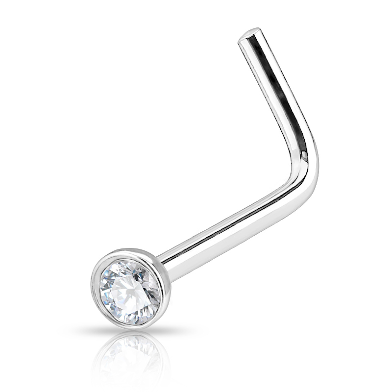De piercing is een combinatie van een neusschroef en een neusstaaf, maar zit goed vast met behulp van de kleine buiging 6 mm onder de staaf. De staaf is verkrijgbaar in twee verschillende draaddiktes zodat je hem echt perfect op maat kan bestellen.
