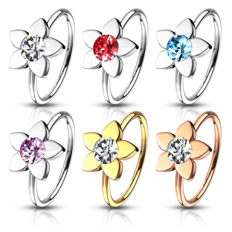 Het sieraad waar je nu naar kijkt is een neusring met een lotusbloem op de voorkant van het sieraad. In de lotusbloem zit een ronde steen waarvan je zelf de kleur kunt kiezen. Je kunt dit sieraad bijvoorbeeld met een roze steen of een rode steen kopen. Daarnaast kun je ook zelf de kleur van het sieraad zelf kiezen - kies onder andere tussen een goudkleurige of blank glanzende variant van het sieraad. Zo kun je dus helemaal zelf jouw perfecte sieraad samenstellen. Wij willen er echter wel op wijzen dat de gouden en roodgouden variant van het sieraad alleen verkrijgbaar zijn met een transparant steentje.