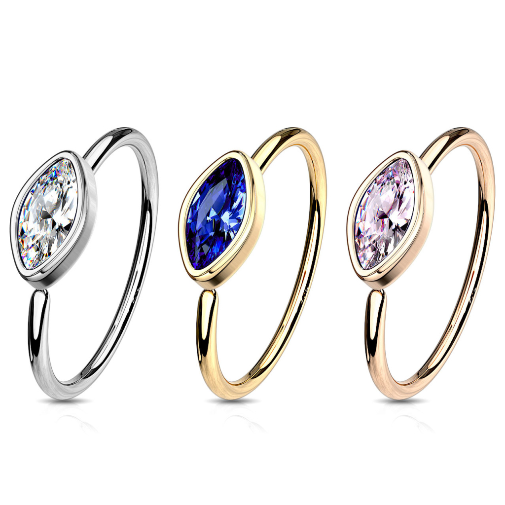 De ringen hier bestaan uit chirurgisch staal en meten 0.8 mm in draaddikte en 8 mm in diameter. Deze ring is perfect te gebruiken in een navelpiercing. Je kunt het inbrengen door het te buigen en draaien, waarbij het goed zijn ronde vorm behoudt. Op de voorkant van het sieraad vind je een mooi ovaal ontwerp met een glanzende steen erin. Dit ontwerp is uit messing vervaardigd en gecoat om overeen te komen met de rest van de ring.