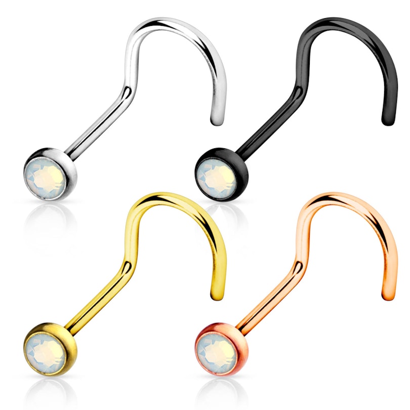 Ben jij op zoek naar een mooi nieuw sieraad voor je neuspiercing? Neem dan eens een extra kijkje naar deze super mooie neusschroef met een prachtig opaalsteentje aan het uiteinde. Het neusschroefje is een goed alternatief voor de wat meer eenvoudige neusstaaf, aangezien deze veel beter vast zit in de neus en er geen uitstekende delen aan de binnenkant zitten. Een neusschroef moet echter wel een beetje voorzichtig ingebracht worden, maar wanneer het eenmaal zit, kan het er in principe niet meer uitvallen.