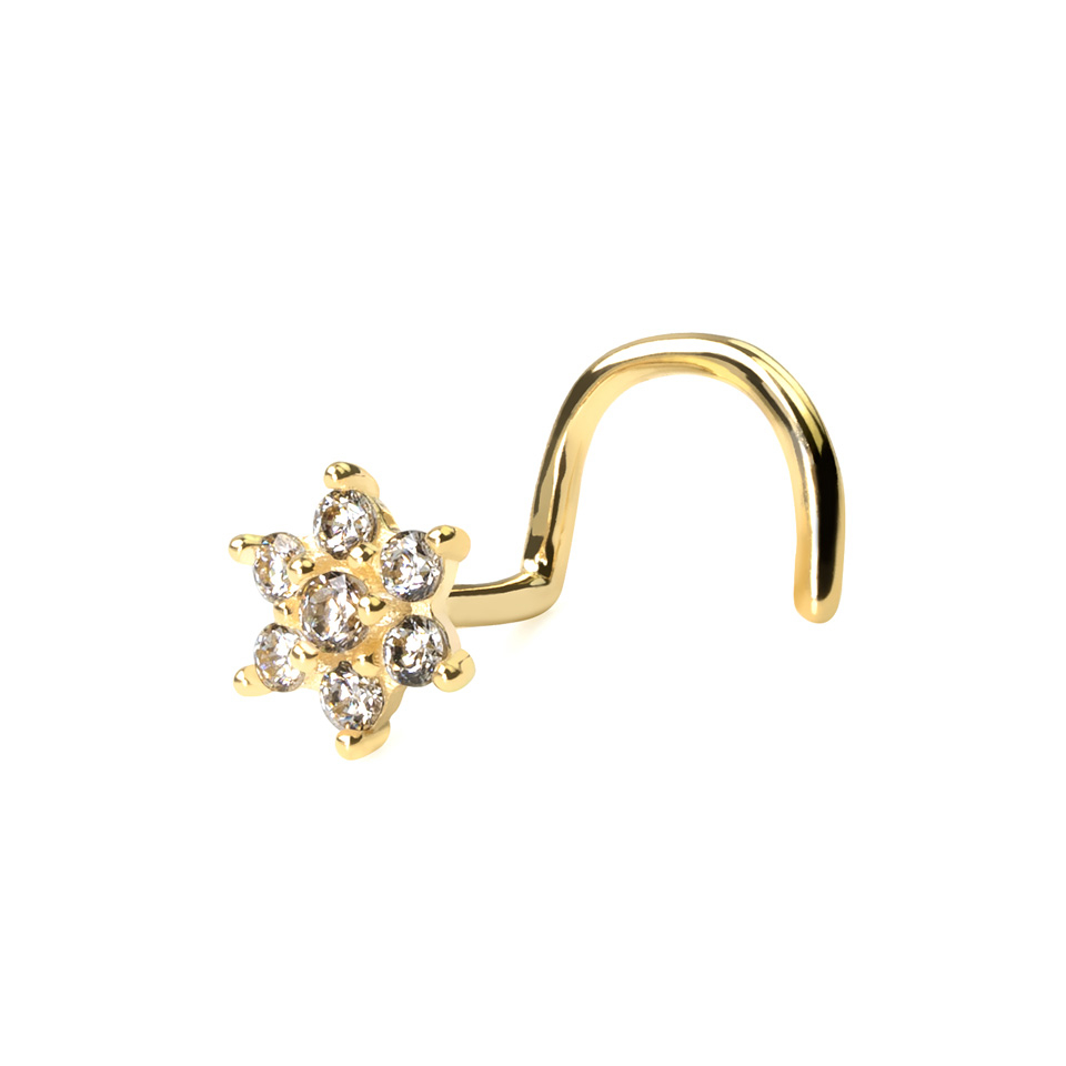 Deze neusschroef van 14 karaats goud is uitgerust met een schattige kleine bloem op de voorkant. De bloem is gecreëerd door zeven stenen samen te voegen, waarvan er zes in een cirkel geplaatst zijn om de zevende steen in het midden, als de centrum van de bloem. Alle steentjes worden op hun plek gehouden door kleine vangarmpjes, en er is geen gebruik gemaakt van lijm o.i.d., zodat de steentjes goed vast blijven zitten.