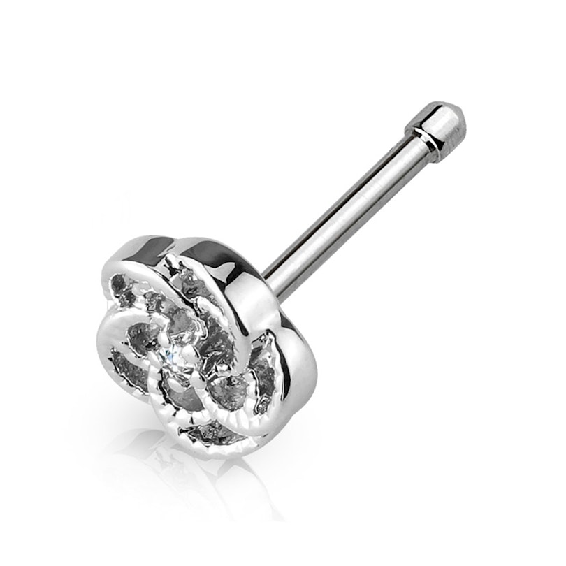 Deze mooie neusstaaf bestaat uit een rechte staaf met een mooie roos op de voorkant. De roos is onwijs gedetailleerd met open bladeren die elkaar overlappen, en een beetje structuur hebben dankzij de kleine knoppen op de randen van de bladeren. In het midden van de roos is een klein steentje gemonteerd, wat het spiegel glanzende ontwerp prachtig matcht.