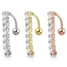 Het sieraad dat je in de bovenstaande productafbeelding ziet, bestaat uit een gebogen staaf van chirurgisch staal. Aan de onderkant zit wat normaal de bovenste bal zou zijn geweest, maar omdat dit een omgekeerde navelpiercing is, wordt de bovenste bal aan de onderkant geplaatst en niet aan de bovenkant. De hanger die zich meestal onderaan bevindt, bevindt zich nu echter bovenaan. Het maakt het sieraad ideaal voor gebruik als je in het onderste deel van je navel bent gepiercet. Je kunt het echter ook gemakkelijk gebruiken in een ''normale'' piercing - Dan zullen de stenen net boven de navel uitsteken en zowel staaf, bal als navel bedekken.