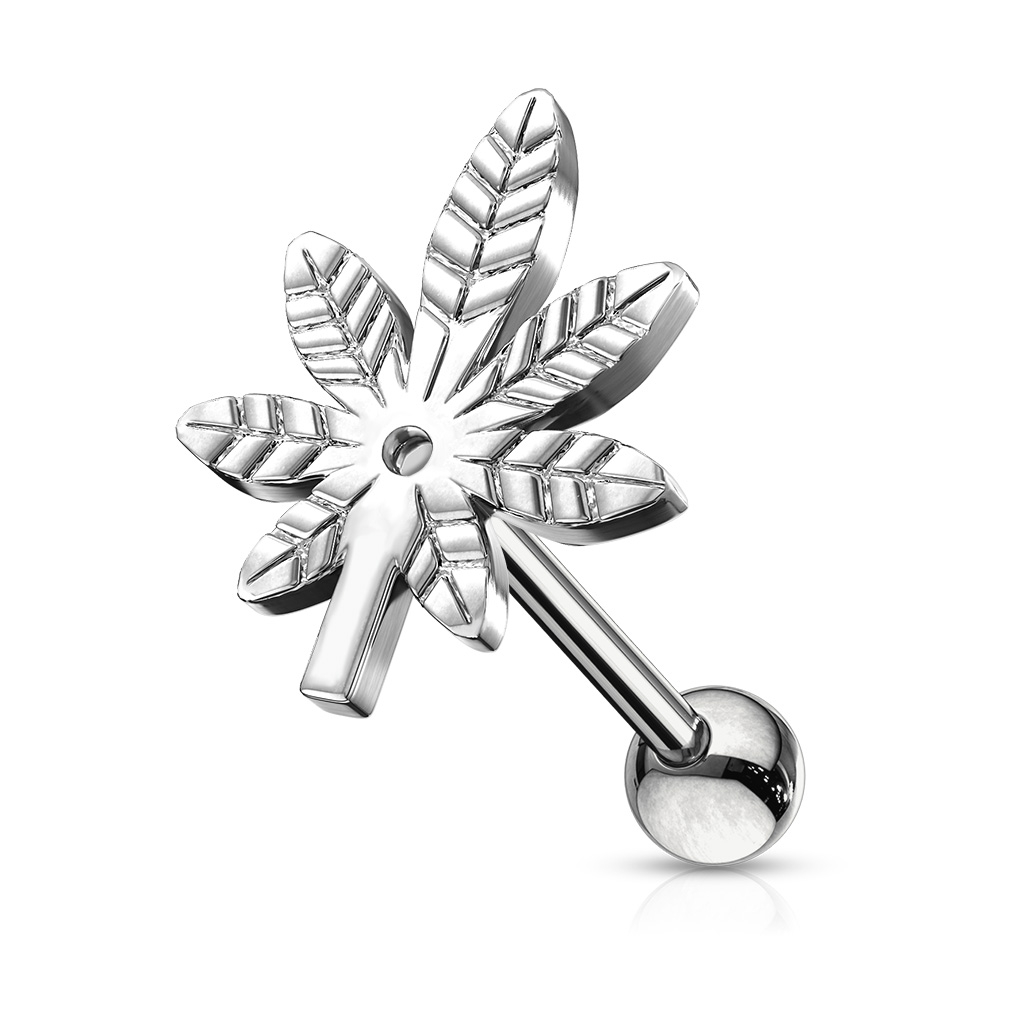 Het sieraad dat je hier ziet, bestaat in al zijn eenvoud uit een rechte staaf van 6 mm, met een mooi blad aan de voorkant. Met zijn opvallend gevormde bladeren en uiterlijk kunnen we niet twijfelen aan wat voor blad het is. Een hennepblad. Als je tegen cannabis bent, kunnen we ook zeggen dat het een esdoorblad is :) Aan het andere uiteinde zit een vergrendelingsbal van 3 mm, die gemakkelijk aan- en af kan worden geschroefd. Vanwege de vorm van het sieraad kan deze het beste als oorpiercing worden gebruikt. Als je echter een andere piercing hebt waarbij de afmetingen en vorm van het sieraad het toelaat, kan deze daar natuurlijk ook worden gebruikt. De staaf en de bal zijn gemaakt van chirurgisch staal en het blad is van gerhodineerd messing.