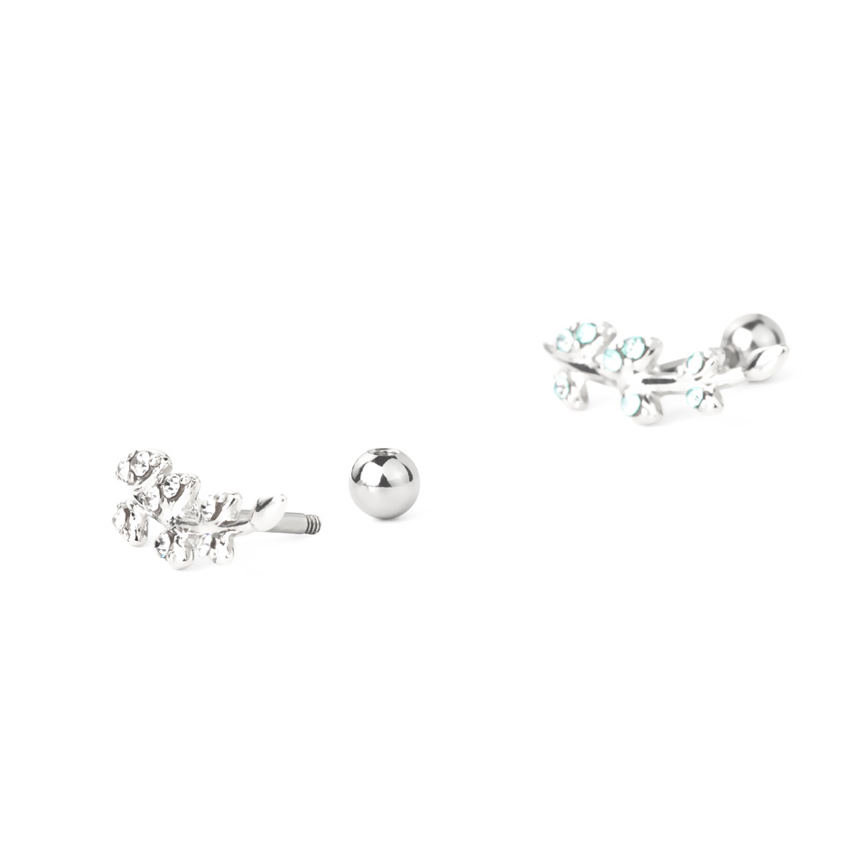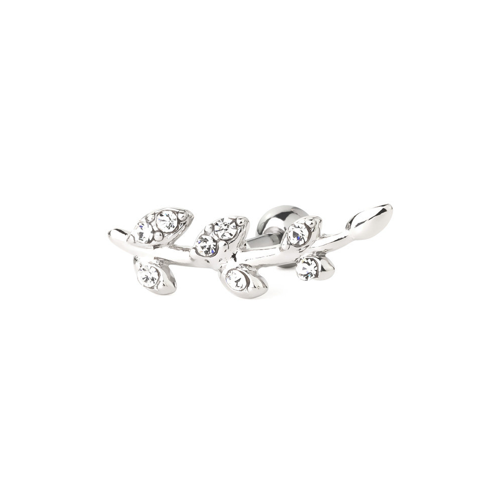Het sieraad heeft een draaddikte van 1,2 mm en is ontworpen met een klein takje dat een beetje gebogen is. Het takje is versierd met mooie kleine blaadjes aan beide kanten en is verkrijgbaar in drie verschillende kleuren. De steentjes op dit model komen in de kleuren: wit, turquoise of roze.