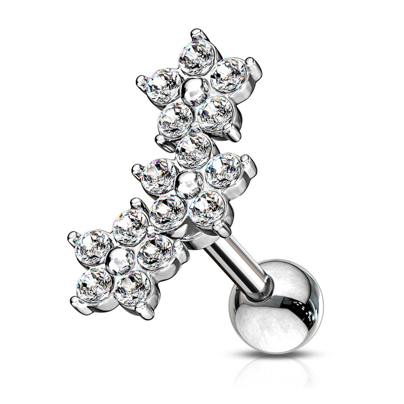 Deze sieraden zijn perfect als helix piercing. De drie bloemen aan de voorkant zijn licht gebogen, dus het ontwerp volgt de vorm van het oor. De voorkant is ongeveer 12 mm lang en bestaat uit drie kleine bloemen. Deze bloemen zijn in verschillende varianten beschikbaar - hier verandert alleen de kleur van de bloemen. De grootte, het materiaal en de kleur van het materiaal blijft hetzelfde.