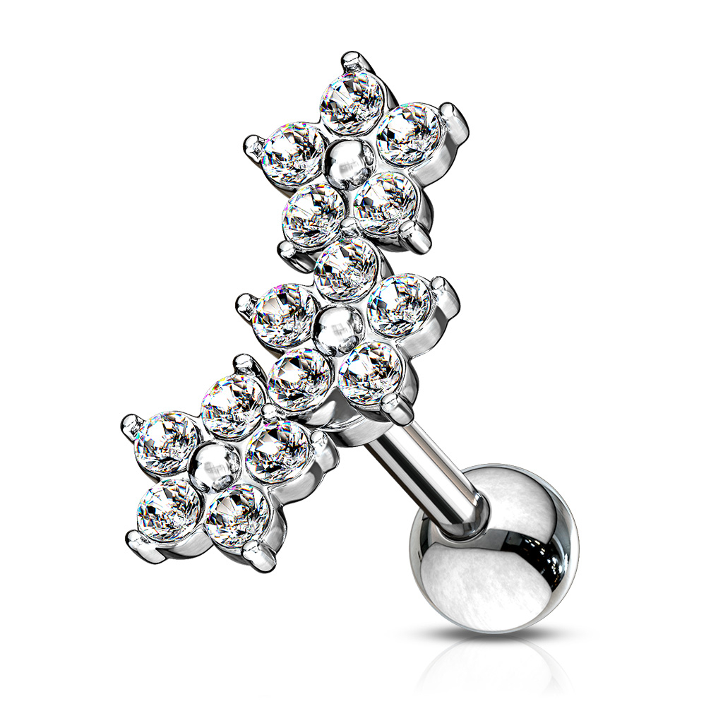 Deze sieraden zijn perfect als helix piercing. De drie bloemen aan de voorkant zijn licht gebogen, dus het ontwerp volgt de vorm van het oor. De voorkant is ongeveer 12 mm lang en bestaat uit drie kleine bloemen. Deze bloemen zijn in verschillende varianten beschikbaar - hier verandert alleen de kleur van de bloemen. De grootte, het materiaal en de kleur van het materiaal blijft hetzelfde.