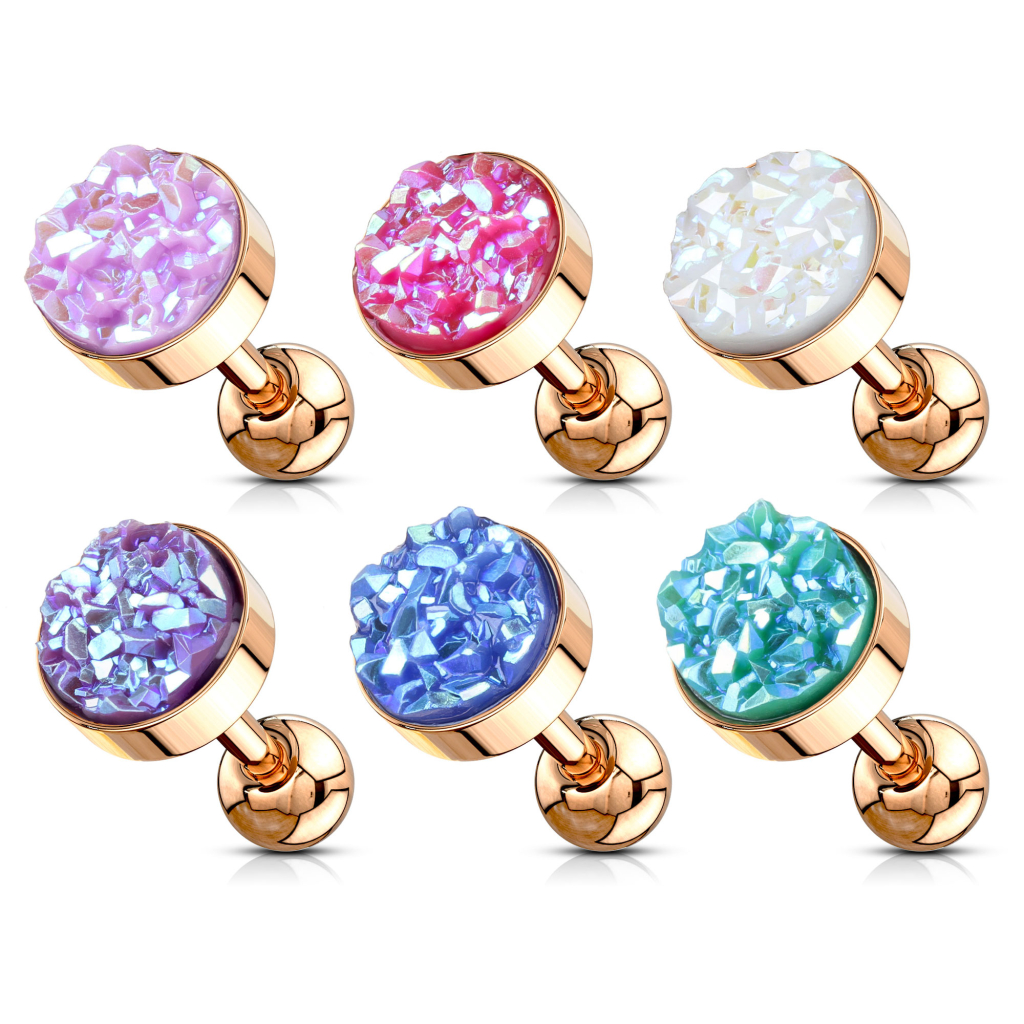Hier ontvang je een kleine en discrete oorpiercing met een grote persoonlijkheid. Het sieraad meet 6 mm in lengte en heeft een top bal met dezelfde maat. Het is echter wat in de top bal zit wat het sieraad zo'n geweldige boost geeft. De top bal is namelijk uitgerust met een zogeheten druze steen, wat niet een steen is maar een oppervlak van kleine kristallen. De kristalformatie wordt in verschillende kleuren aangetroffen, en er zijn zoveel kleuren als de regenboog rijk is - en bij dit sieraad kun je dus ook tussen verschillende kleuren kiezen, zoals bijvoorbeeld blauw en wit. Het gave aan deze kristallen is dat je niet alleen de hoofdkleur die je zelf kiest ontvangt, maar ook heel veel andere kleuren in de kristallen wanneer het licht weerkaatst wordt door het sieraad.