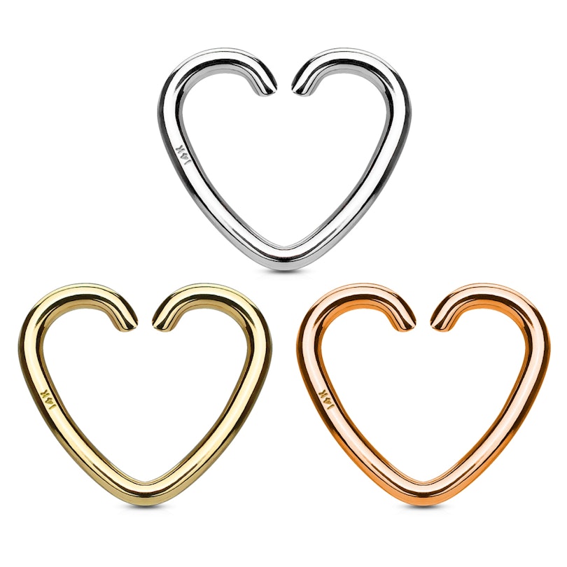 Het hartje is verkrijgbaar in verschillende varianten, en je kunt zelf kiezen in welk type goud je dit sieraad wilt hebben. Ook kun je zelf de staafdikte kiezen, zodat je helemaal zelf het beste sieraad voor jouw piercing kan kiezen. De afmetingen van de binnenkant van dit hart zijn 10 mm breed en 9 mm hoog. Alle varianten hebben dezelfde afmetingen, op de staafdikte na dan. Het sieraad is dan ook heel erg geschikt voor de meeste oorpiercings. Je kunt hem bijvoorbeeld heel goed dragen in je tragus, helix en daith piercing.