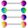 Op de afbeelding hierboven zie je een piercing staaf die gemaakt is van chirurgisch staal met twee leuke, kleurige balletjes aan ieder uiteinde. De balletjes zijn gecoat met een laagje rubber en hebben allebei veranderlijke kleurennuancen. Je kunt de kleuren kiezen al naar gelang je gevoel. De verschillende modellen hebben dezelfde staafdikte van 1,6 mm en een lengte van 16 mm. Beide balletjes kunnen afgeschroefd worden, zodat je altijd een langere of kortere staaf kunt gebruiken als je dat nodig hebt.