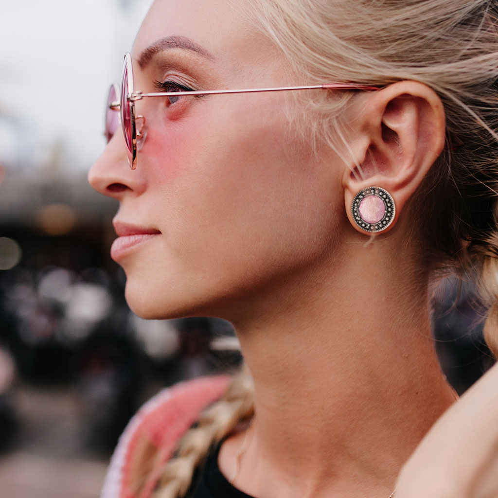 De plug waarop je geklikt hebt, heeft een antieke coating op de voorkant gekregen. Hierdoor verkreeg het zijn donkere kleur, zoals je op de afbeelding hierboven kunt zien. De donkere kleur contrasteert mooi met de roze kleur en zodat het wat leuker is om naar te kijken, is de steen omringd met blanke bolletjes.