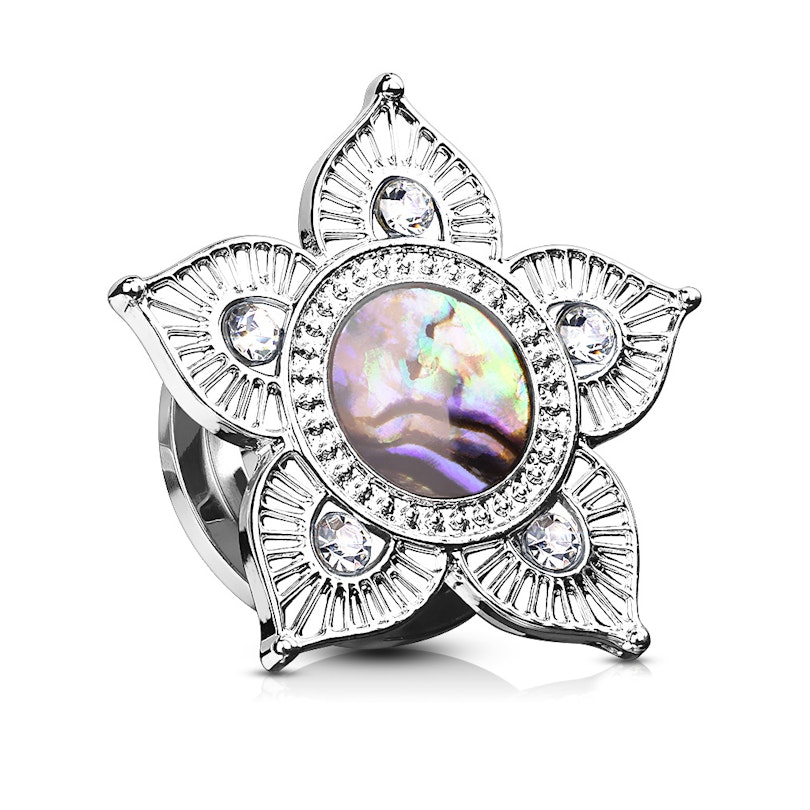 Je hebt al een glimp opgevangen van de mooie plug op de afbeelding hierboven toen je naar beneden scrolde om deze tekst te lezen. Deze plug is uitgerust met een messing voorkant, gevormd als een lotusbloem. Ieder bloemblad heeft een aantal kleine verdiepingen, en er zit op de onderkant van ieder blad een transparante steen - met als uitzondering daarbij de groottes 3 mm, 4 mm, 5 mm en 6 mm. In het midden van de bloem zit de grote zeeoor. Een zeeoor is een soort schelp met een parelmoerachtige kleur aan de binnenkant van de schelp. Daarom worden zeeoren vaak gebruikt voor het creƫren van sieraden. Aangezien zeeoor een natuurmateriaal is, is het ook belangrijk om te melden dat geen twee schelpen hetzelfde zijn. Daarom zal de voorkant altijd verschillend zijn bij alle sieraden.