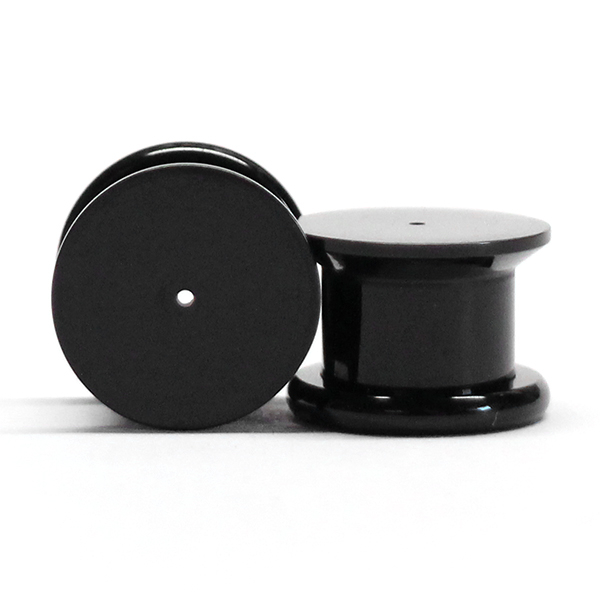De plug is gemaakt van zwart acryl en heeft een schroefdraad aan de achterkant, zodat hij makkelijk in en uit het oor te nemen is. Aan de voorkant is het helemaal vlak met een klein gaatje van 0,8 mm in het midden, wat heel geschikt is voor normale oorringen of oorbellen die je normaal gesproken alleen kunt dragen als je gewoon kleine gaatjes hebt in je oren.