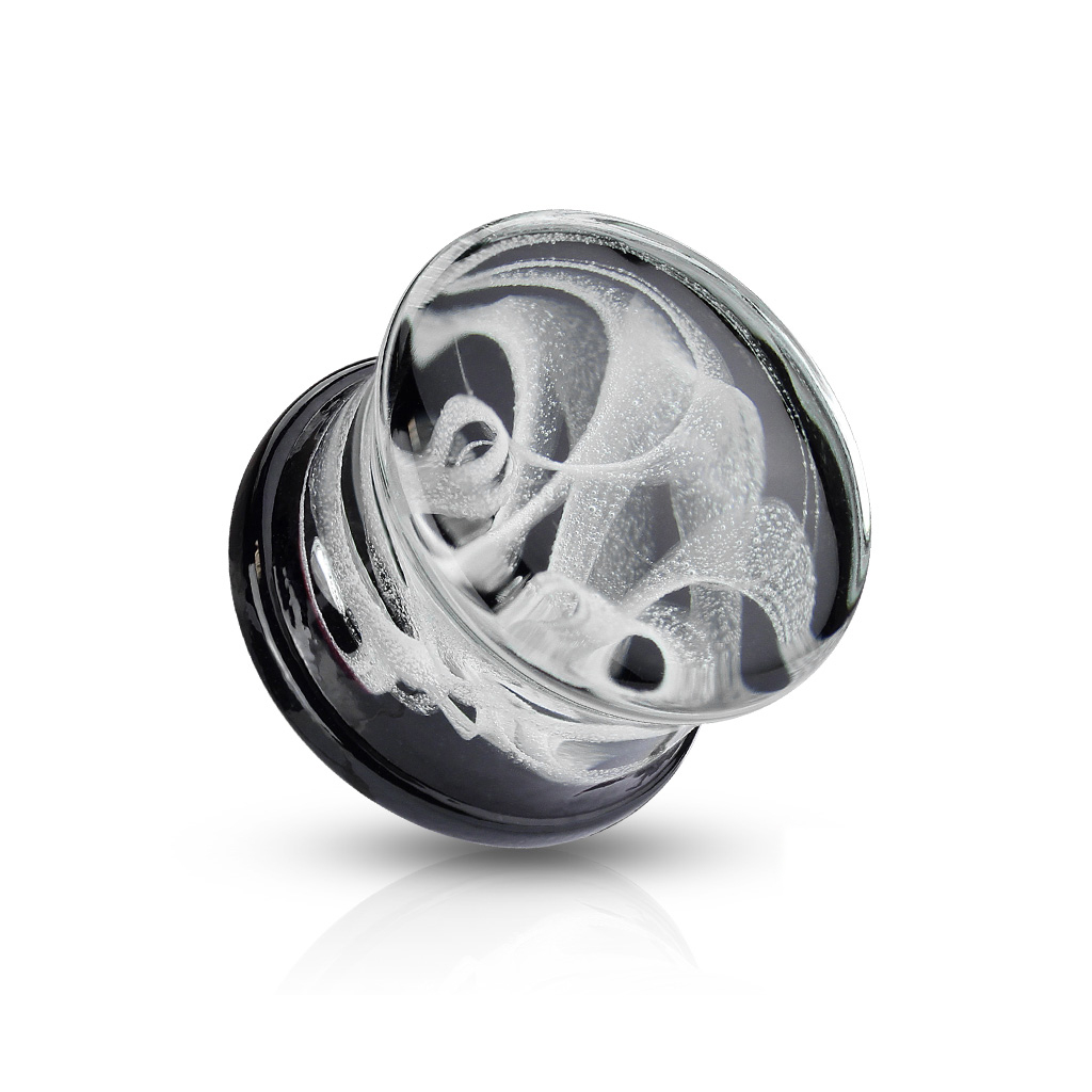 Het sieraad bestaat hoofdzakelijk uit doorzcithig glas, waarbij de achtergrond zwart is gemaakt zodat de mooie, lichte rookwervel goed zichtbaar is. Verwacht echter niet dat je een plug zal ontvangen met echte rook, aangezien het hier gaat om een kunstmatig rookpatroon. Maar het patroon is ook van plug tot plug verschillend, want de rookwervel is bij iedere plug anders uitgepakt.Het effect wordt natuurlijk nog beter zichtbaar na mate het sieraad ook groter wordt.