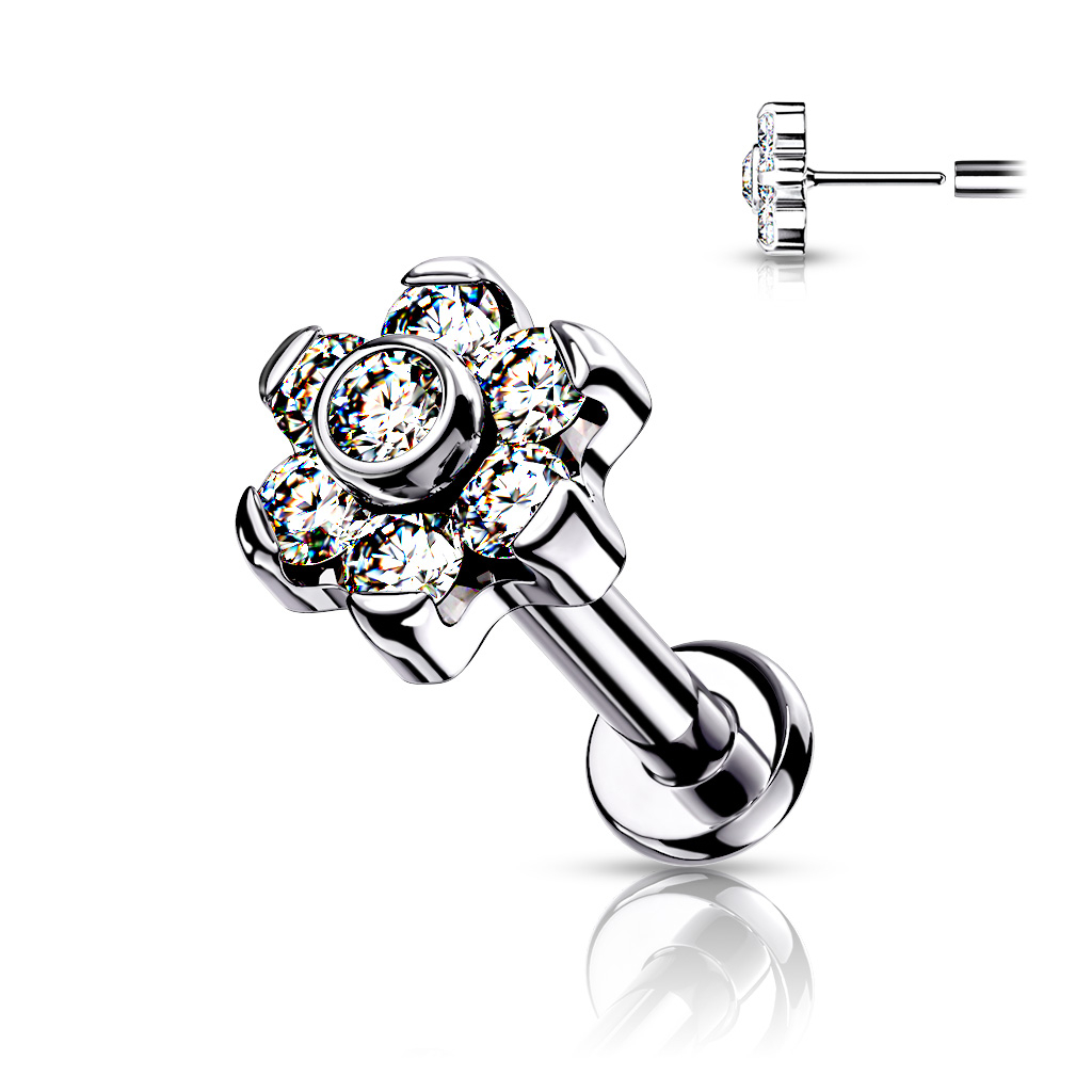 De bovenkant van dit labret bestaat uit zeven kleine steentjes die samen een prachtige bloem vormen met zes blaadjes en een middelsteen. Je kan zelf de kleur van de steentjes kiezen. Aan de achterkant van de bloem zit een staafje die je vastmaakt aan de platte achterkant met een push-in systeem. De achterkant gaat door het piercinggaatje en daar druk je de bloem vast zodat deze onder spanning komt te staan. Met de tijd zal je merken dat de spanning wellicht wat afneemt maar dit kan je makkelijk verhelpen door het staafje licht te buigen wanneer de top in de staaf zit.
