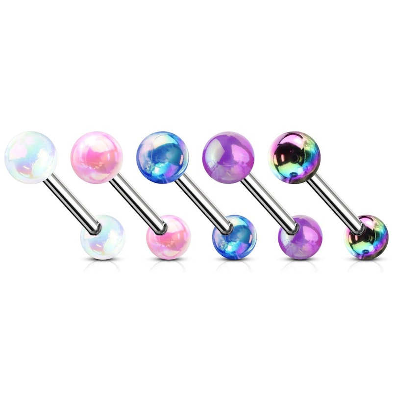 Met deze rechte staaf ontvang je zowel een onwijs simpel en elegant ontwerp als een sieraad dat opvallend is. De balletjes op dit sieraad trekken namelijk alle aandacht naar zich toe met de vele kleuren en de mooie glans. Ze zijn bedekt met een coating: dit geeft ook de metallic look. De balletjes meten 6 mm, zodat er genoeg plek is om de schoonheid in volle glorie te tonen.