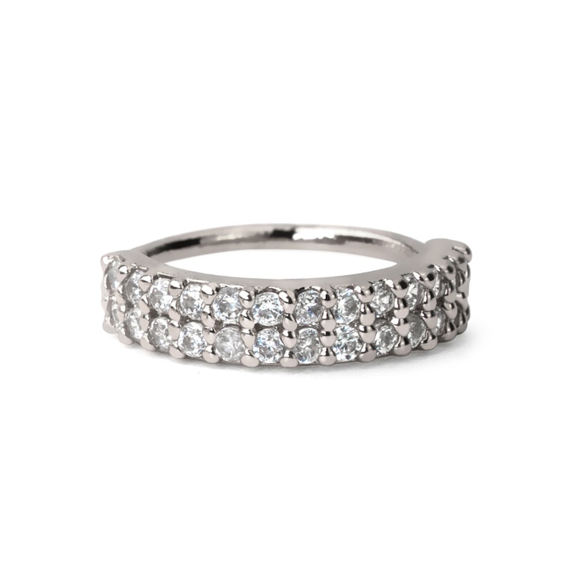 Deze ring is gemaakt van messing en kan worden geopend door de twee ring uiteinden los te schroeven. Als de piercing daar is waar het zou moeten zijn, kun je het op dezelfde manier sluiten. De sieraden zijn verkrijgbaar in drie mooie kleuren, waarvan twee gouden versies bedekt met 14 karaats goud. Het zilver is geplatineerd. Er zijn niet minder dan twee rijen stenen - in totaal zijn er 26 kleine heldere sprankelende stenen te vinden. De andere helft van het sieraad zal in je piercing zitten en is daarom bedekt.