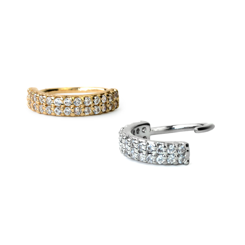 Deze ring is gemaakt van messing en kan worden geopend door de twee ring uiteinden los te schroeven. Als de piercing daar is waar het zou moeten zijn, kun je het op dezelfde manier sluiten. De sieraden zijn verkrijgbaar in drie mooie kleuren, waarvan twee gouden versies bedekt met 14 karaats goud. Het zilver is geplatineerd. Er zijn niet minder dan twee rijen stenen - in totaal zijn er 26 kleine heldere sprankelende stenen te vinden. De andere helft van het sieraad zal in je piercing zitten en is daarom bedekt.