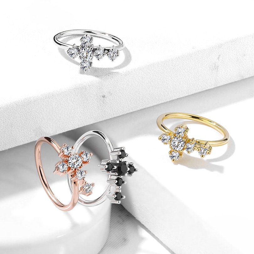 Het juweel bestaat uit messing en is 0.8mm in draaddikte en 8mm in diameter. Als je de blanke versie kiest dan is het sieraad gecoat met een platinumlaagje, de twee gouden versies hebben dan weer een 14 karaats goudlaagje. Zoals je waarschijnlijk wel al hebt opgemerkt, is het sieraad op de voorkant voorzien van een mooi kruis. Dit kruis is met zes kleine stenen bezet, waarvan je de kleur zelf kan kiezen. Zo kun je kiezen voor transparante of zwarte stenen.