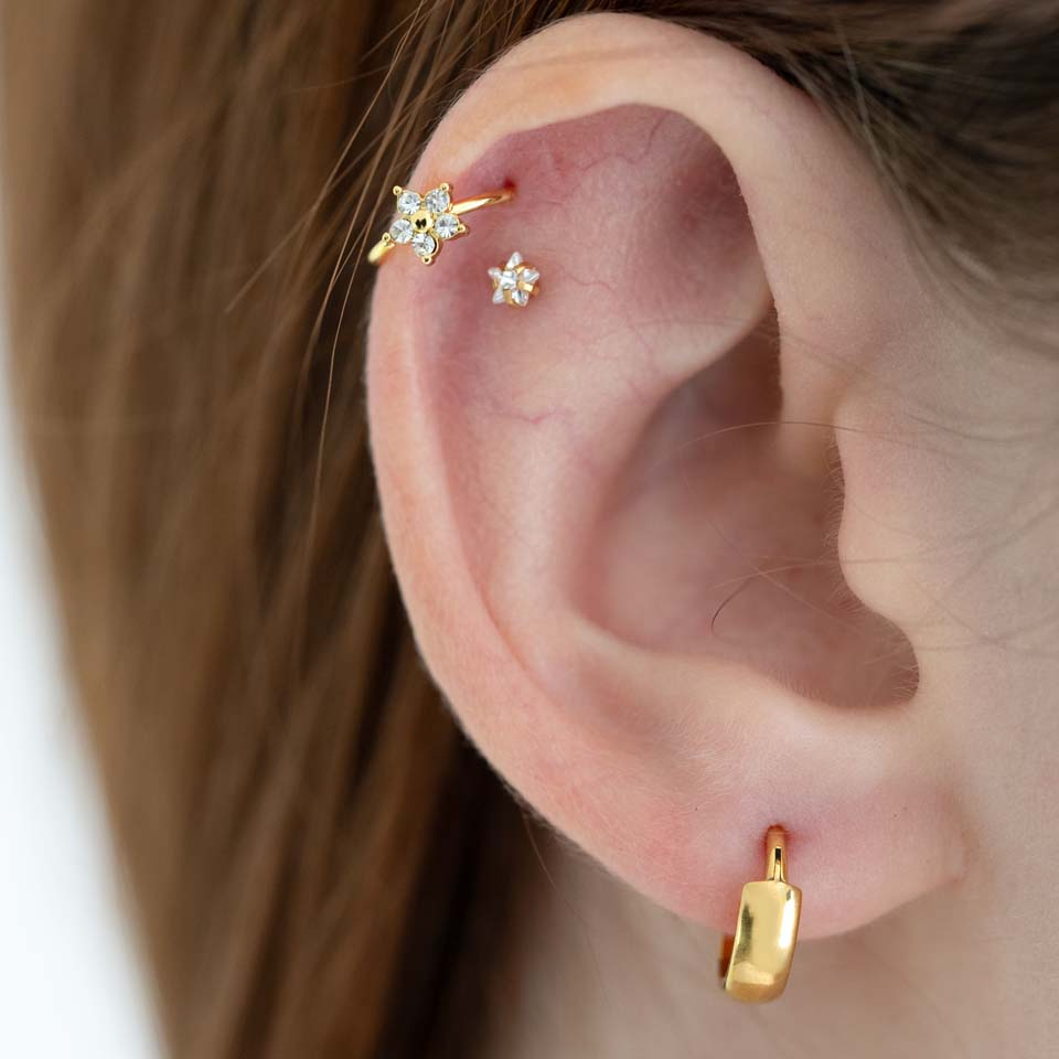 Deze sierlijke ring van chirurgisch staal heeft een sierlijke bloempje met vijf bloemblaadjes van steentjes rond een centrale kraal. Verkrijgbaar in goud en zilver, gemaakt van chirurgisch staal, dus sterk, duurzaam en aanslagbestendig. Met een dunne draaddikte van 0.8 mm is deze ring ideaal voor je neuspiercing, maar kan ook gedragen worden in je helix of andere oor piercings. Gewoon draaien om te openen, in je piercing steken en weer draaien om vast te zetten.