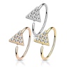 De voorkant is versierd met een mooi driehoekje dat met vele heldere en fonkelende steentjes bezet is. Ook dit driehoekje is gecoat om zo te matchen met de ring waarop het bevestigd is.