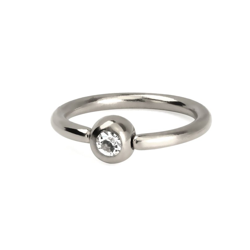 De ring hier heeft geen losse delen zoals bij de meeste ballclosure ringen. Dit balletje is namelijk vast gelast, zodat je het balletje niet af kunt nemen voordat je ring in doet. Je moet bij deze ring de uiteinden van elkaar af twisten, zodat de ring eruit ziet zoals te zien is rechtsboven op de foto. Dan kun je hem probleemloos indoen en weer samen draaien.