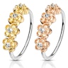 Hier kun je een eenvoudige, maar heel mooie ring met vier bloemen op de rand terugvinden. De bloemen zijn met vijf bloemblaadjes en een centrale steen voorzien. De transparante steentjes staan in een mooi contrast met de warme kleur van de bloemen. Je kunt de kleur van de bloem zelf kiezen uit een gouden of roodgouden variant. Het sluitmechanisme van de ring zorgt ervoor dat je de ring kunt openen en sluiten door de uiteindes zachtjes open te duwen.