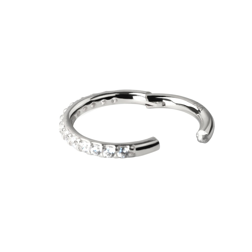 Ringen met scharnieren zijn fantastisch. Ze zijn ongelooflijk makkelijk te openen en te sluiten, zonder dat je je zorgen hoeft te maken dat je sieraad uit valt. Deze ring is gemaakt van 14 karaats goud waarvan je meerdere versies kunt krijgen, inclusief het elegante 14 karaats witgoud. Aan de buitenkant van de ring, dus het meest zichtbare deel, wordt het sieraad gedecoreerd door talloze kleine heldere steentjes.