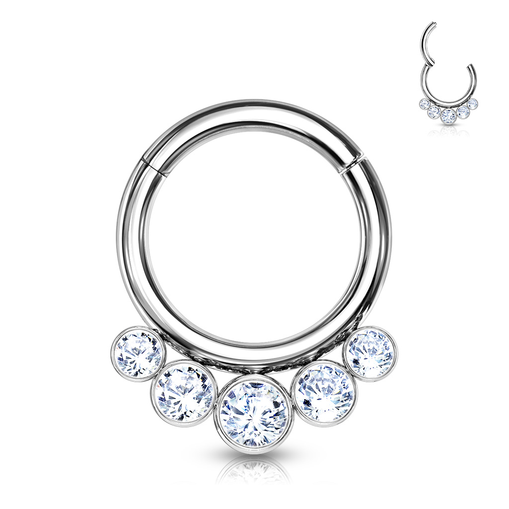 Deze ring is gemaakt van titanium, ƩƩn van de beste materialen die je kan kiezen en vaak gebruikt voor nieuwe piercings. Het sieraad heeft een draaddikte van 1.2 mm en is verkrijgbaar met een diameter van 8 mm en 10 mm. Welke grootte je ook kiest, de ring heeft vijf stenen aan de onderkant. De middelste steen is het grootst en de stenen worden kleiner naar de zijkanten toe.