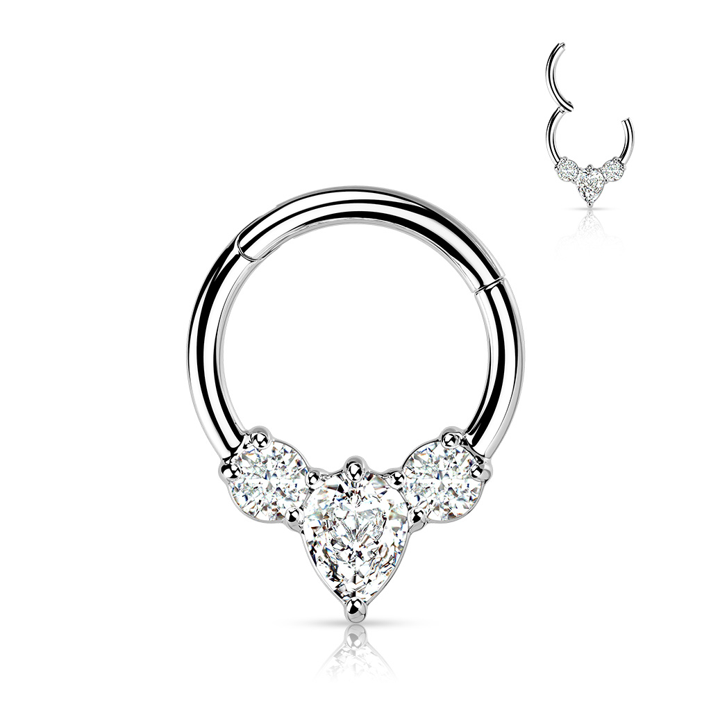 Deze solide chirurgisch stalen ring geeft nou net die schittering die je piercing nodig heeft. Het sieraad heeft een duurzame PVD coating, wat zorgt voor een selectie aan stralende kleuren die langer goed blijven dan bij standaard coating. De ring heeft tevens een flashy steentjes ontwerp dat bestaat uit een grote peervormige middensteen en twee kleinere ronde steentjes. Deze heldere steentjes zijn naar voren gericht, wat de ring perfect maakt voor septum piercings of bepaalde oorpiercings, zoals de daith of tragus.